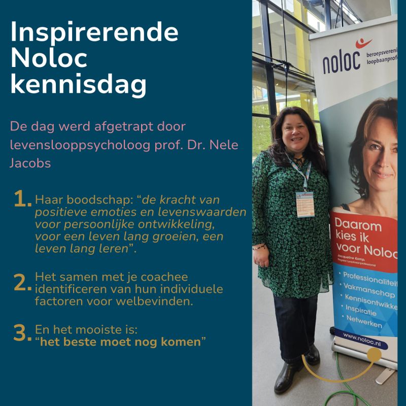 Onze collega Lynsey Karijodinomo was deze week op het Noloc congres: ‘Een inspirerende Noloc kennisdag! Dr. Nele Jacobs sprak over positieve emoties. Christina, Loopbaan Pro Award winnares, raakte me met haar werk voor nieuwkomers. Aaltje Vincent ontving terecht de Carrière Award! Zeer waardevolle workshops over bevlogenheid, diversiteit en inclusie. Dankbaar voor deze ervaring!’
