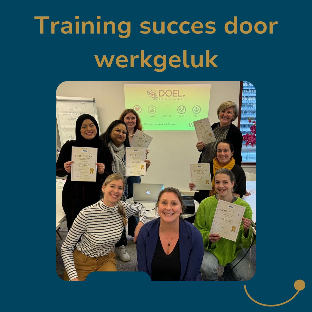 Gisteren hebben we weer een enthousiaste groep deelnemers meegenomen in onze training over werkgeluk. Trainers Britta van den Bergh Weerman en Stefanie Bult gaven meer inzicht in wat werkgeluk inhoudt, waarom het belangrijk is en hoe je voor jezelf meer werkgeluk kan creëren. Je hebt daar namelijk zelf invloed op!